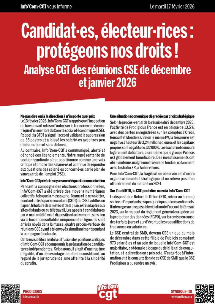 Le 13 février 2026, Info’Com-CGT a appris que l’inspection du travail avait refusé d’autoriser le licenciement économique d’un membre du Comité social et économique (CSE). Rappel : la CFDT a signé l’accord validant la suppression de 36 postes et a laissé les salarié·es avec très peu d’information et sans défense.