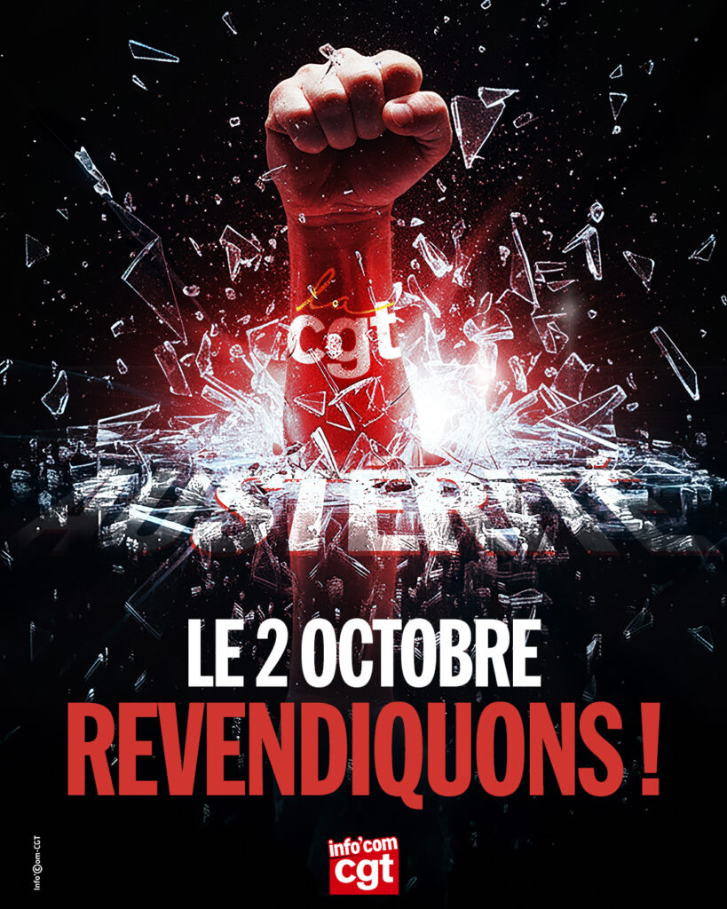 Info’Com-CGT appelle donc à la grève les salarié·es de la presse, de l’édition, de la publicité et de la communication le jeudi 2 octobre. Ensemble, portons nos revendications pour l’abandon du budget antisocial, pour la défense de la protection sociale et des retraites, pour la taxation des dividendes et des gros patrimoines, pour des moyens renforcés aux services publics, pour des emplois durables et une transition écologique juste.
