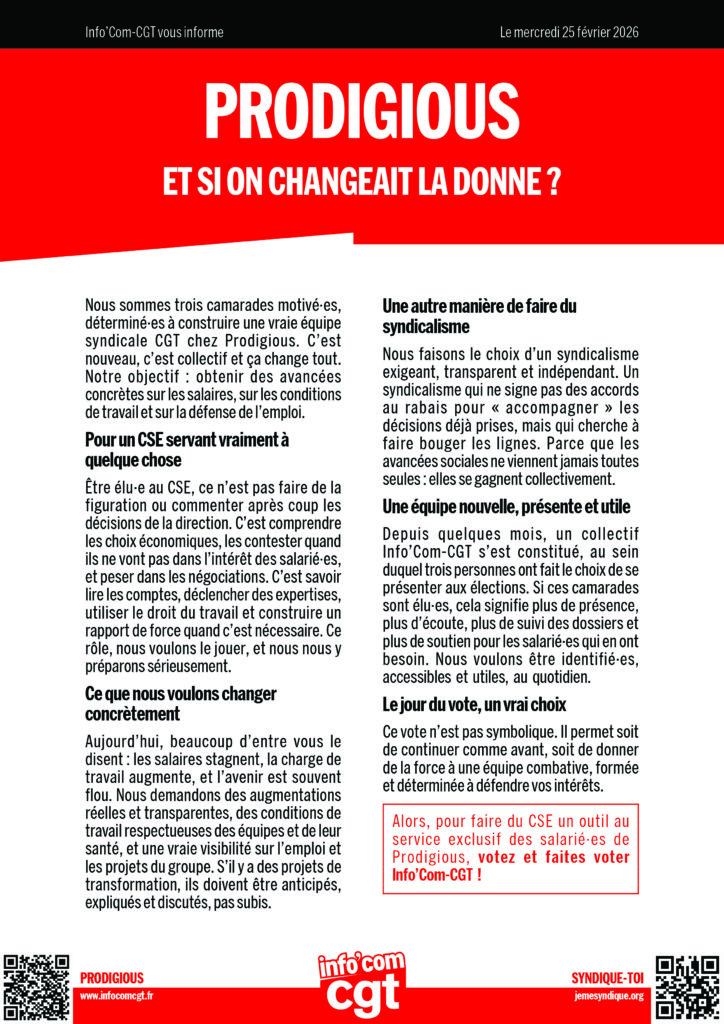 Alors, pour faire du CSE un outil au service exclusif des salarié·es de Prodigious, votez Info’Com-CGT.