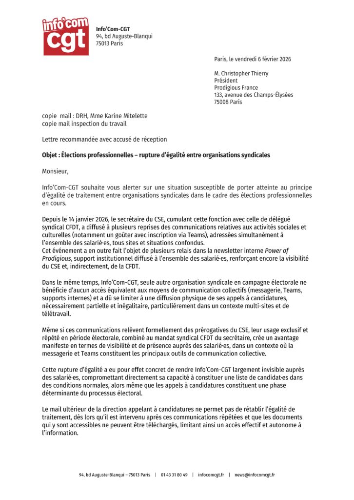 Dans le même temps, Info’Com-CGT, seule autre organisation syndicale en campagne électorale ne bénéficie d’aucun accès équivalent aux moyens de communication collectifs (messagerie, Teams, supports internes) et a dû se limiter à une diffusion physique de ses appels à candidatures, nécessairement partielle et inégalitaire, particulièrement dans un contexte multi-sites et de télétravail.