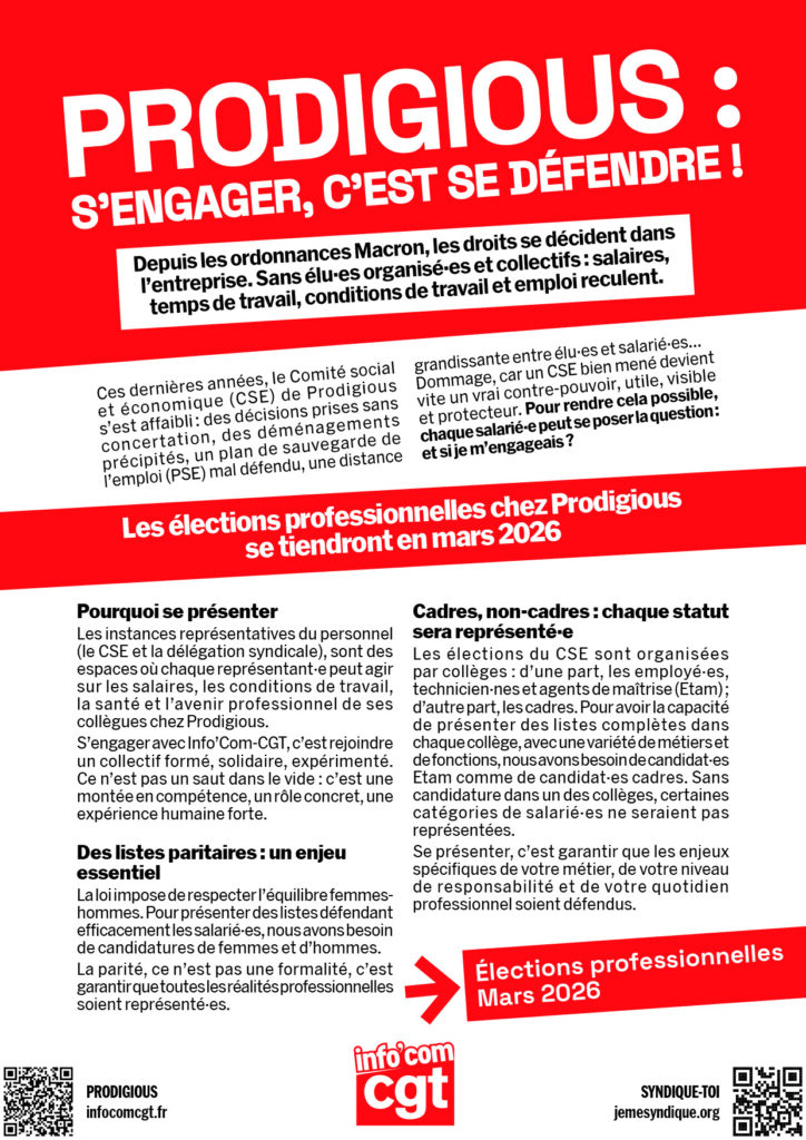 Ces dernières années, le Comité social et économique (CSE) de Prodigious s’est affaibli : des décisions prises sans concertation, des déménagements précipités, un plan de sauvegarde de l’emploi (PSE) mal défendu, une distance grandissante entre élu·es et salarié·es… Dommage, car un CSE bien mené devient vite un vrai contre-pouvoir, utile, visible et protecteur. Pour rendre cela possible, chaque salarié·e peut se poser la question : et si je m’engageais ? Les élections professionnelles chez Prodigious se tiendront en mars 2026.